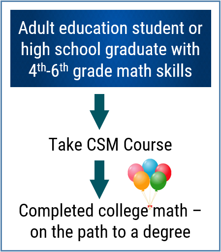 - Colleges can articulate CSM for college math credit, opening a pathway from adult education and schools. Colleges can also use CSM as a pre-college bridge course, as a regular math course/curriculum, as a course for students on probation, as a college stop-out recovery program, and more.