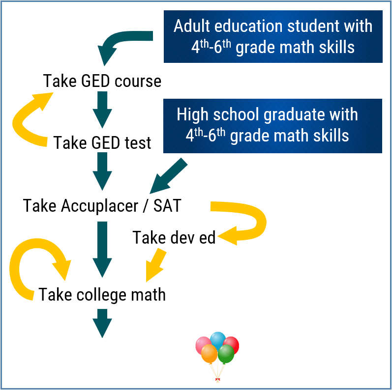 Before Excel Together West Virginia, the road to a college degree was daunting for many West Virginians without a high school diploma, and the 45% of high school graduates that score Below Basic on tests -- both of these groups have roughly elementary grade math skills. Looking at the diagram, to fulfill the college degree requirement, a high school dropout with remedial math skills would need to: