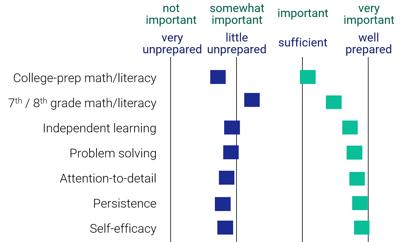 - From school and college, how well prepared are students for these factors? (shown in blue)