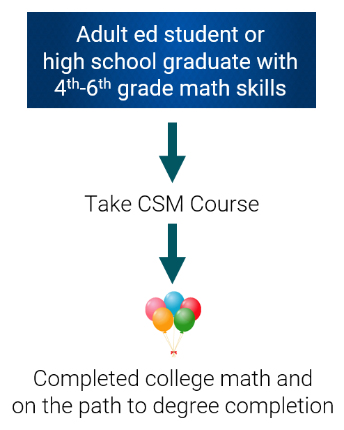 Our CSM Course is a short-term, humane, practical, supportive course that leads to the CSM Certificate, which earns college math credit, certifies employability skills, and is recognized by employers. CSM includes deep remediation, and even people who have struggled academically all their lives are able to complete the course.