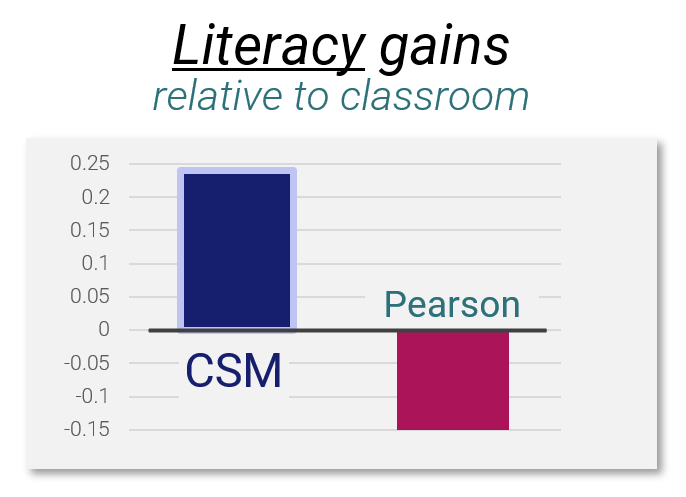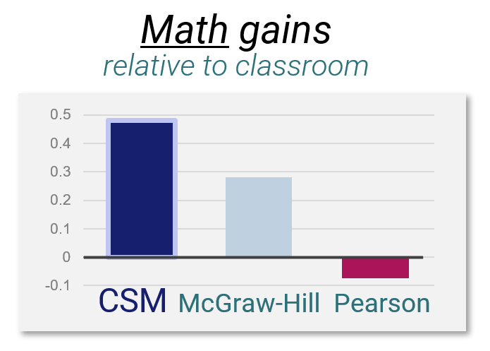 A national study of educational technology with adult learners (and mainly opportunity youth) found that CSM had the largest math and literacy gains compared to gold-standard programs like ALEKS from McGraw-Hill and MyFoundationsLab from Pearson,
