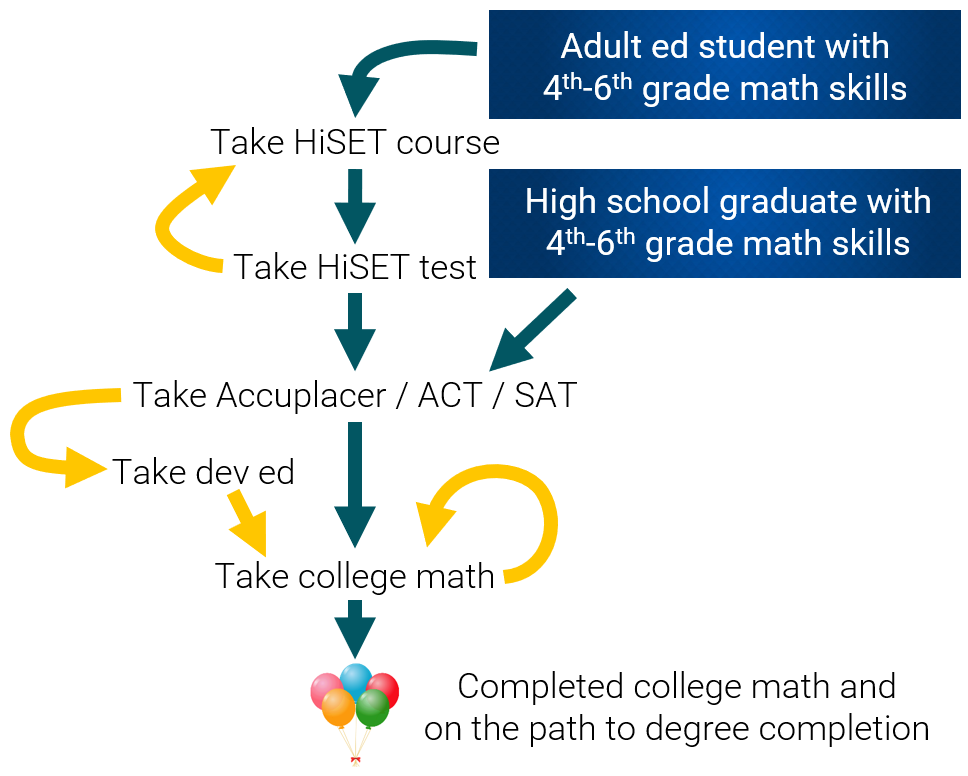 The road to a college degree is daunting for many West Virginians, and one of the scariest pieces is the general education college math requirement. Looking at the diagram, to fulfill the requirement, a high school dropout with 4th to 6th grade math skills would need to: