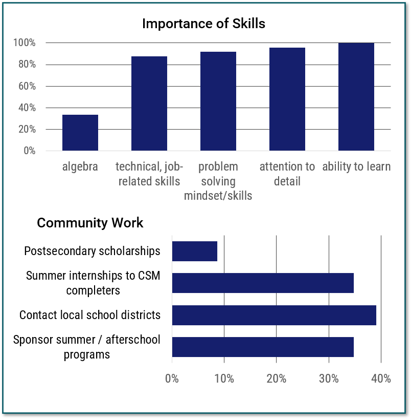 Additionally, over a third of manufacturers indicated that they would offer internships to students who had earned a CSM Certificate, and nearly 40% indicated their interest in working with schools to encourage offering CSM.